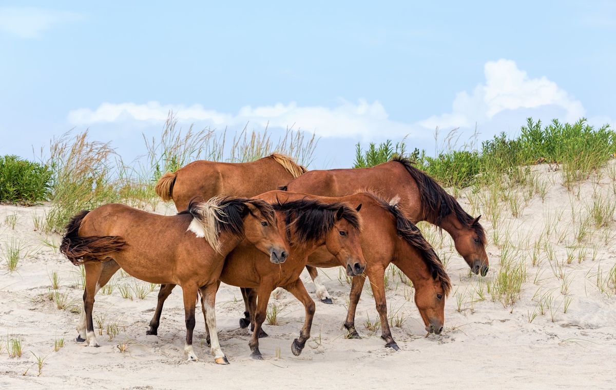 The feral horses known as the Assateague horses inhabit the 60-kilometer long barrier island called Assateague island, located off the eastern coast of Delmarva in Maryland.