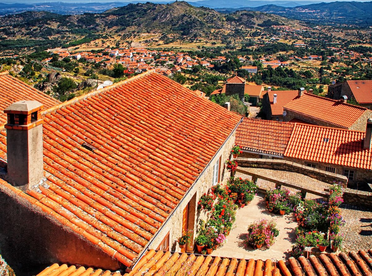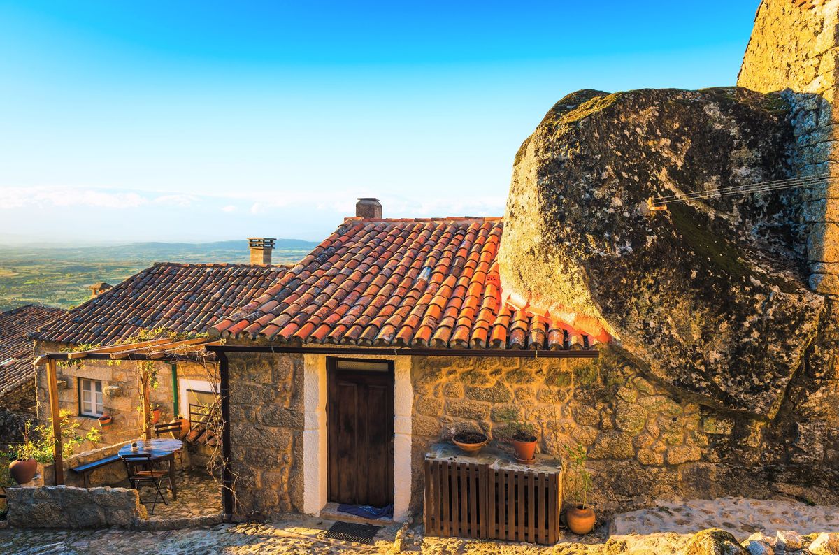 Granite-hewn houses possess doorways of Manueline style. The red-roofed houses sandwiched among large mossy stone structures stand out from the stark gray landscape of Mt. Monsanto, east of Idanha-a-Nova. , The ruins of a castle from the Lusitanian conquest offer a magnificent view of the countryside stretching as far as Serra da Estrela.